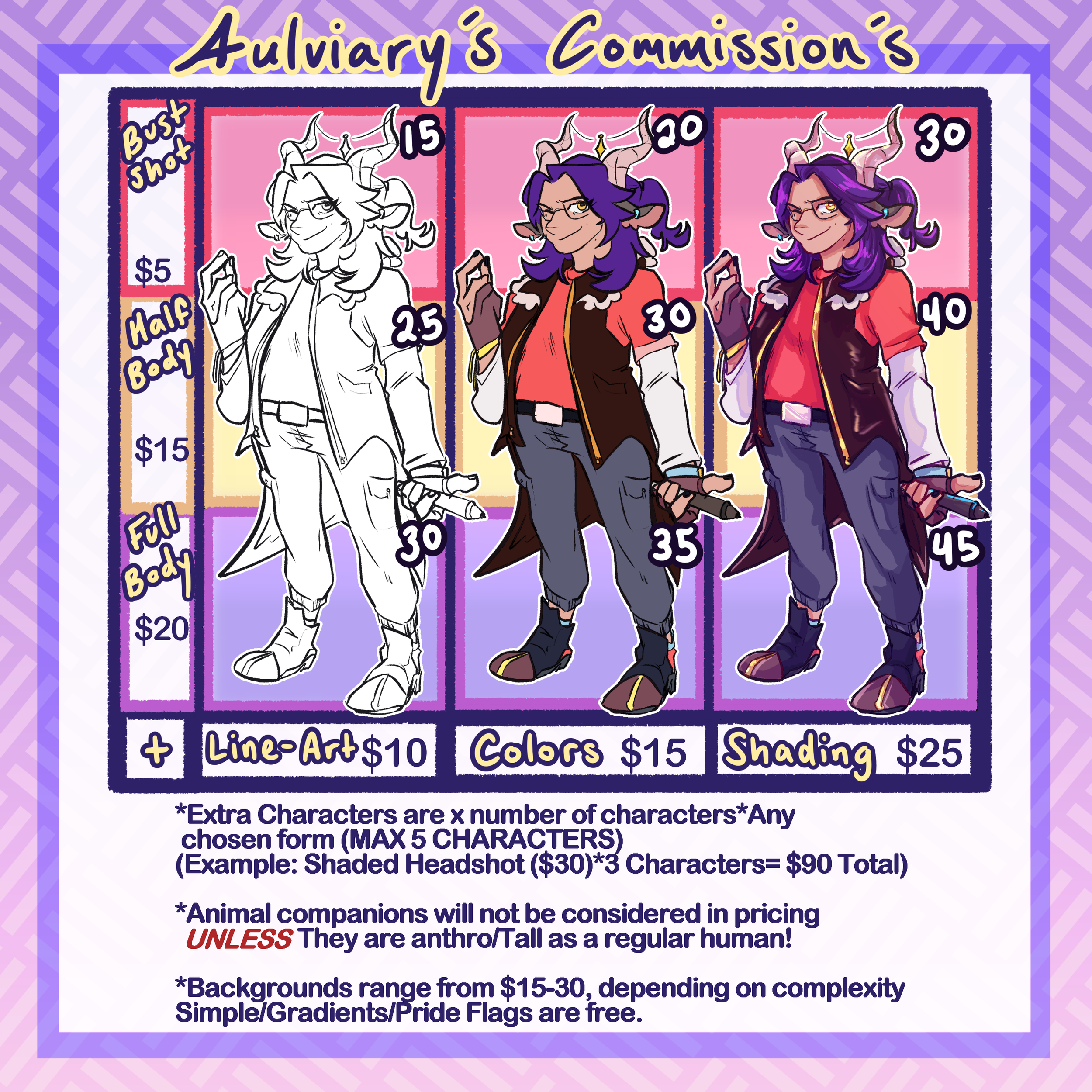 - Please give references for what you want (can be words or images). Be as specific with your request and include any poses/backgrounds as needed.